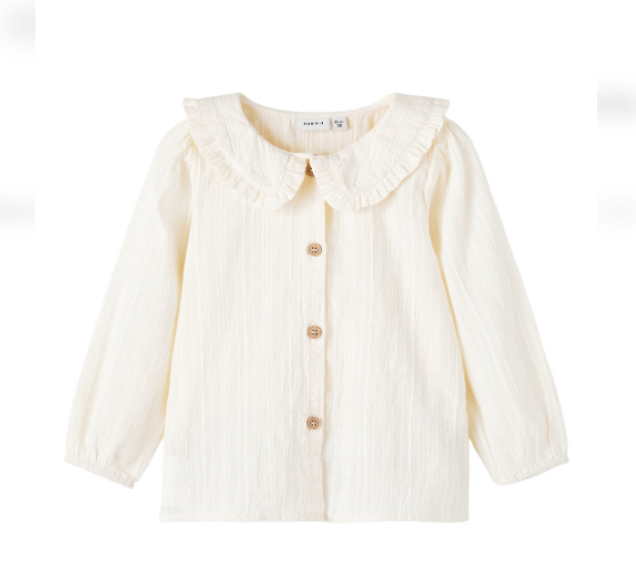 Kjempefin bluse med krage til de minste jentene i en behagelig off-white farge. Åpning i front med lekre knapper i imitert tre.